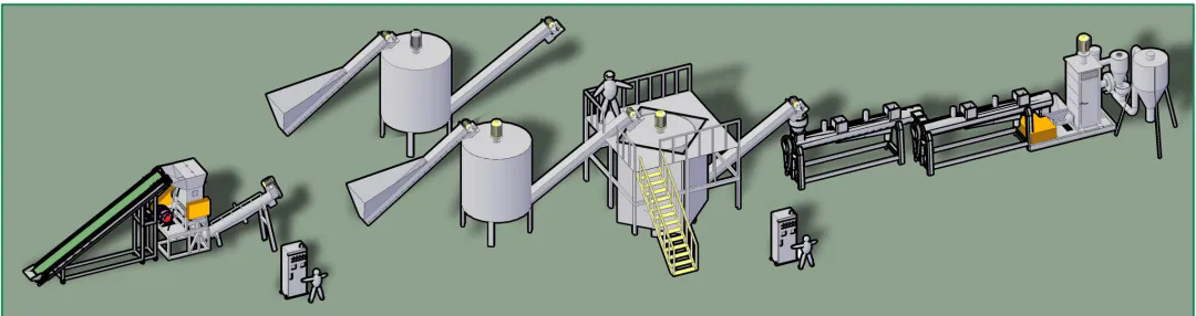 此套生產(chǎn)線主要處理日常生活中所廢舊的牛奶瓶、化妝品瓶、洗發(fā)水瓶、藍桶、廢舊框、塑料椅、塑料桶等HDPE、PP、PO等浮水硬質(zhì)塑料的再生回收清洗,進而可以進行造粒后再利用。從節(jié)能、環(huán)保方面為用戶考慮,采用不同的方案流程,適合不同廢塑料的回收,提供配套的分揀輸送帶、高速清洗機、塑料表面不干膠標(biāo)簽的去除、金屬分離器、水循環(huán)處理系統(tǒng)等。